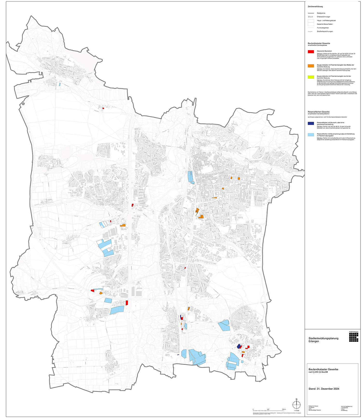 Die Stadt Erlangen hat eine Neuauflage des Baulandkatasters Gewerbe nach § 200 (3) BauGB mit dem Stand 31.12.2024 veröffentlicht. Das Baulandkataster Gewerbe führt sofort oder in absehbarer Zeit bebaubare Flächen in einer Karte auf. Zusätzlich sind die Reserveflächen Gewerbe als Hinweis aufgenommen.